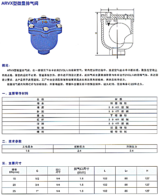 APVX自動排氣閥,在一般情況下,水中約含2V0L%的溶解空氣,在輸水過程中,這些空氣由水中不斷釋放出來,聚集在管線的高點(diǎn)處,形成空氣袋(AIR POCKET),使輸水變得困難,系統(tǒng)輸水能力可因此下降約5-15%。此微量排氣閥主要功能就是排除這2VOL%的溶解空氣,并適合裝置于高層建筑,廠區(qū)內(nèi)配管,小型泵站用以保護(hù)或改善系統(tǒng)的輸水功率及節(jié)約能源。