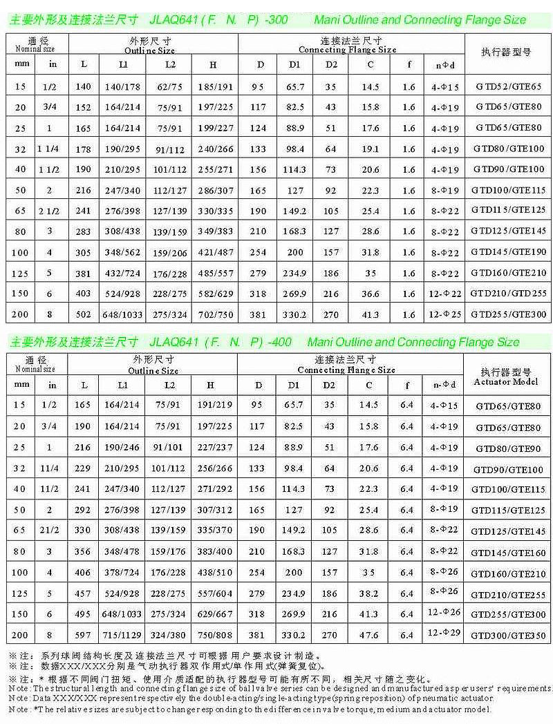 ANSI標(biāo)準(zhǔn)氣動球閥JLQ641結(jié)構(gòu)長度及連接法蘭尺寸可根據(jù)用戶要求設(shè)計制造。主要零部件及密封圈的材質(zhì)可根據(jù)實際工況條件或用戶特殊要求設(shè)計選用。數(shù)據(jù)XXX/XXX分別表示氣動執(zhí)行器雙/單作用式(彈簧復(fù)位)。根據(jù)不同閥門扭距使用介質(zhì)選配的執(zhí)行器型號可能有所不同,相關(guān)尺寸隨之變化。