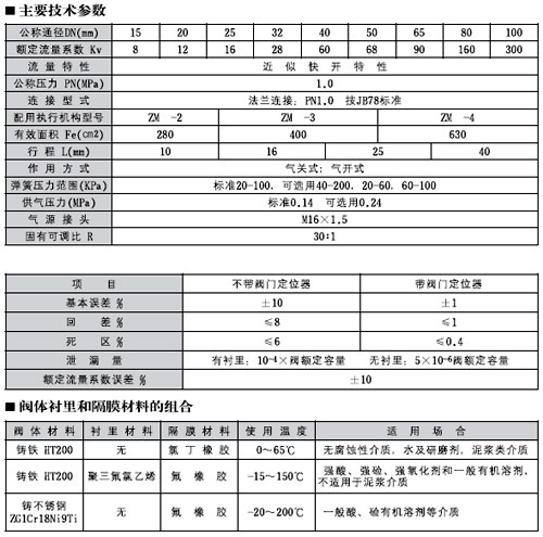 ZMA(B)T一10氣動薄膜隔膜調節閥為無填料函結構、節流元件為彈性隔膜,閥體流道平滑;閥體襯里和隔膜均可采用耐腐蝕材料制造,適用于控制各種腐蝕性和懸浮液介質的調節場合。