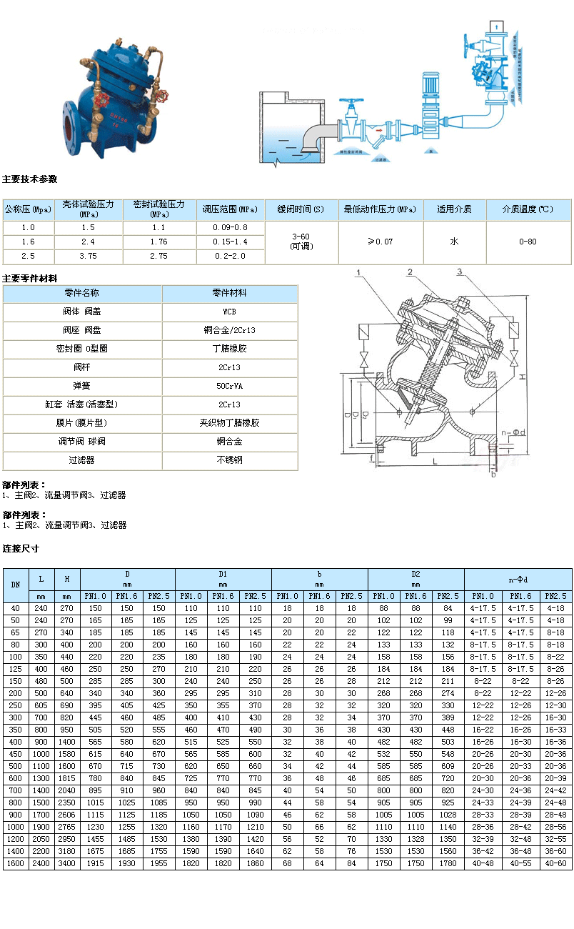 本產(chǎn)品由主閥和調(diào)節(jié)閥及接管系統(tǒng)組成,閥體采用直流式閥體,主閥控制室為膜片式或活塞式的雙控制室結(jié)構(gòu),控制室比一般水力控制閥增加了一個,增加了對主閥的控制功能,實現(xiàn)了對水泵出口的緩慢開啟、全開、緩閉、截止等多功能控制,實現(xiàn)了一個閥門、一次調(diào)節(jié)對水泵出口的多功能控制。