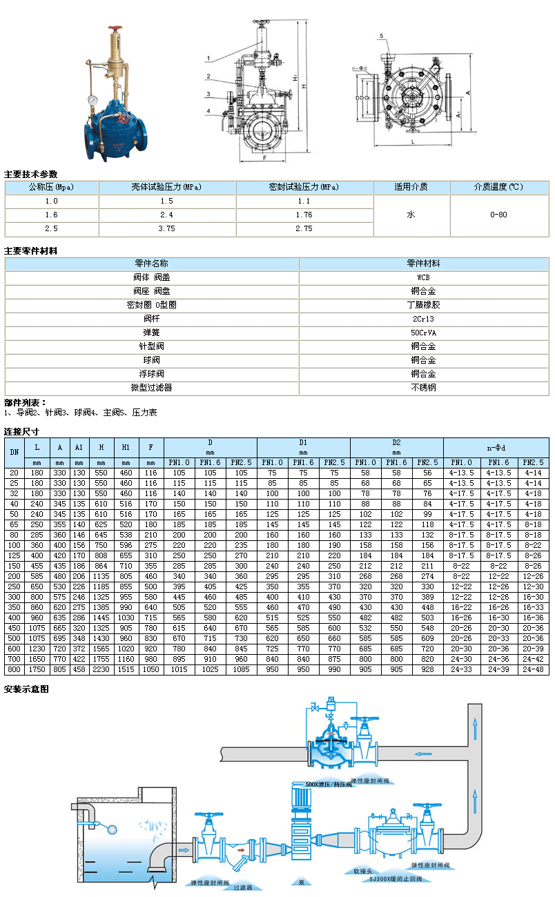 500X泄壓/持壓閥由主閥、泄壓/持壓導閥針閥、球閥、微形過濾器和壓力表組成水力控制接管系統。利用水力自動操作,即可以作泄壓閥用又可作持壓閥用。作泄壓閥用時,可維持供水路壓力在設定的安全值之下;做持壓閥用,可維持主閥上游水壓在設定值之上,保持主閥上游供水壓力。本產品利用水力自力控制,不需要其它裝置和能源,保養簡便,一閥多用。本系列閥門產品廣泛用于高層建筑、生活區等供水管網系統及城市供水工程。1、作泄壓閥:當泄壓/持壓導閥調整為泄壓狀態時,水通過針閥、主閥控制室、球閥A、泄壓/持壓導閥、球閥B流向出口,此時主閥處于開啟狀態。當進口壓力超過泄壓/持壓導閥設定的安全值時,泄壓導閥會自動開啟,通過球閥C放出部分水,使管路泄壓。當壓力恢復到安全值時,泄壓閥自動關閉。作泄壓閥時,各球閥常開。2、作持壓閥:當泄壓/持壓導閥調整為持壓狀態時,只要主閥進口水壓低于導閥設定值,導閥即關閉。主要控制室升壓,主閥關閉。當主閥上游供水壓力超過導閥設定壓力時,持壓導閥才能打開,控制室的水經球閥排至出口,控制室降壓主閥開啟,開始供水,即保持了上游水壓。作持壓閥用時,球閥C常閉或用絲堵換下。